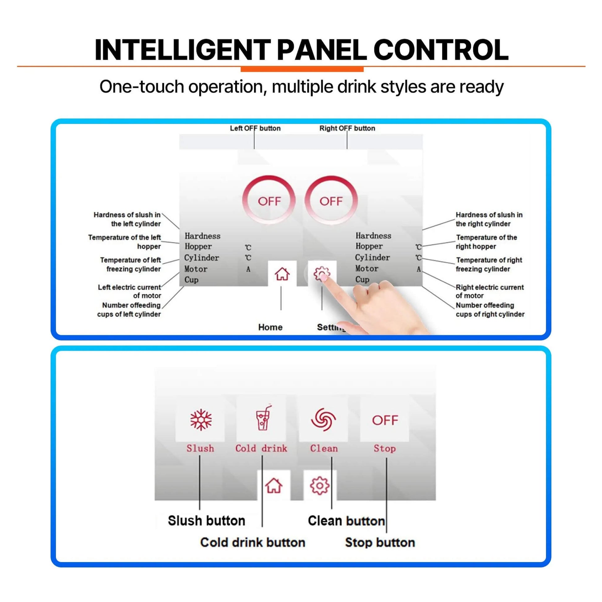 Experience effortless operation with the intuitive 5-inch touchscreen panel, which puts control right at your fingertips. Adjusting the thickness of your frozen treats is simple, allowing you to cater to every preference with a single touch. Beyond just making drinks, this machine is designed to make your life easier with thoughtful features like a one-touch cleaning mode and fault diagnosis. The quiet, energy-efficient compressor ensures that while the drinks are cold, the atmosphere remains comfortable and conversation-friendly, operating at a low noise level that won't disrupt your venue's vibe.