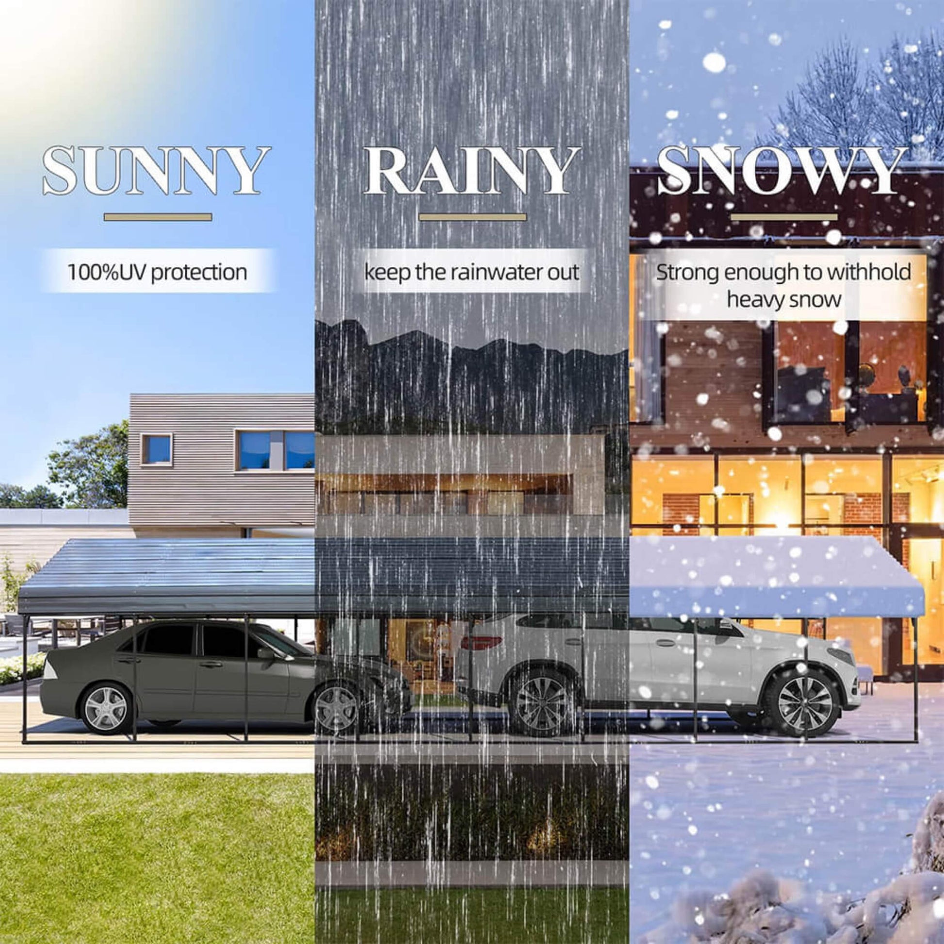 The heart of our carport's unmatched durability lies in its galvanized steel roof and powder-coated steel frame. Unlike the conventional canvas alternatives, our model boasts a rust-resistant steel roof, ensuring your shelter remains in pristine condition through all seasons. Its robust structure is engineered to withstand the test of time, providing a reliable and long-lasting haven for your vehicles.