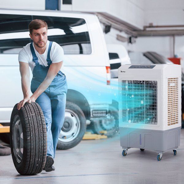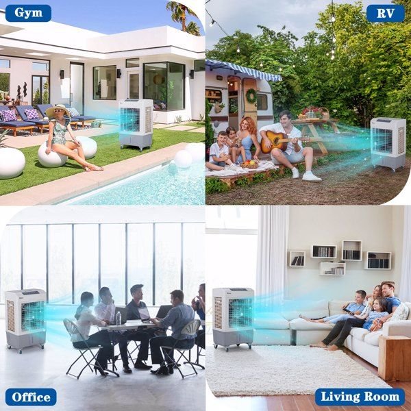 It is no need to bend over to add water at the top. This portable Evaporative cooler fans is built with 4 strong and durable 360°rolling wheels (2 Locking, 2 Non-locking). Even if you are not using it as a cooler, it's a windy machine! This cooling fan can be used outdoor, semi-outdoor and indoor, both household and commercial. It can also play a perfect role in these places: garage, patio, garden, porch, gym room, movie night, BBQ party, family lunch gathering, store, or office.