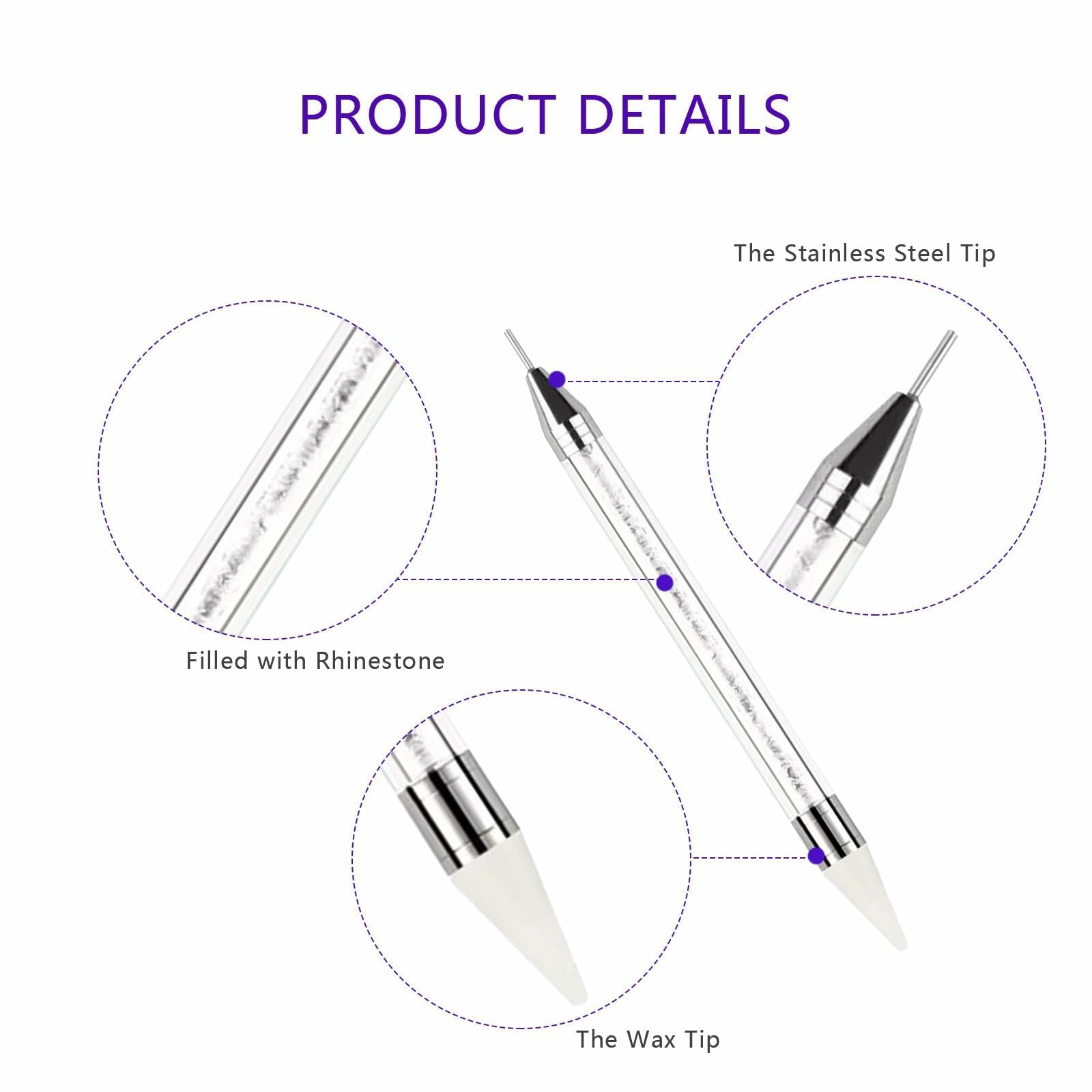 - 【Double Head Rhinestone Picker】The dual-end dotting pen features a self-adhesive wax tip for easy rhinestone pickup and a stainless steel tip for precise application and adjustment of nail embellishments.