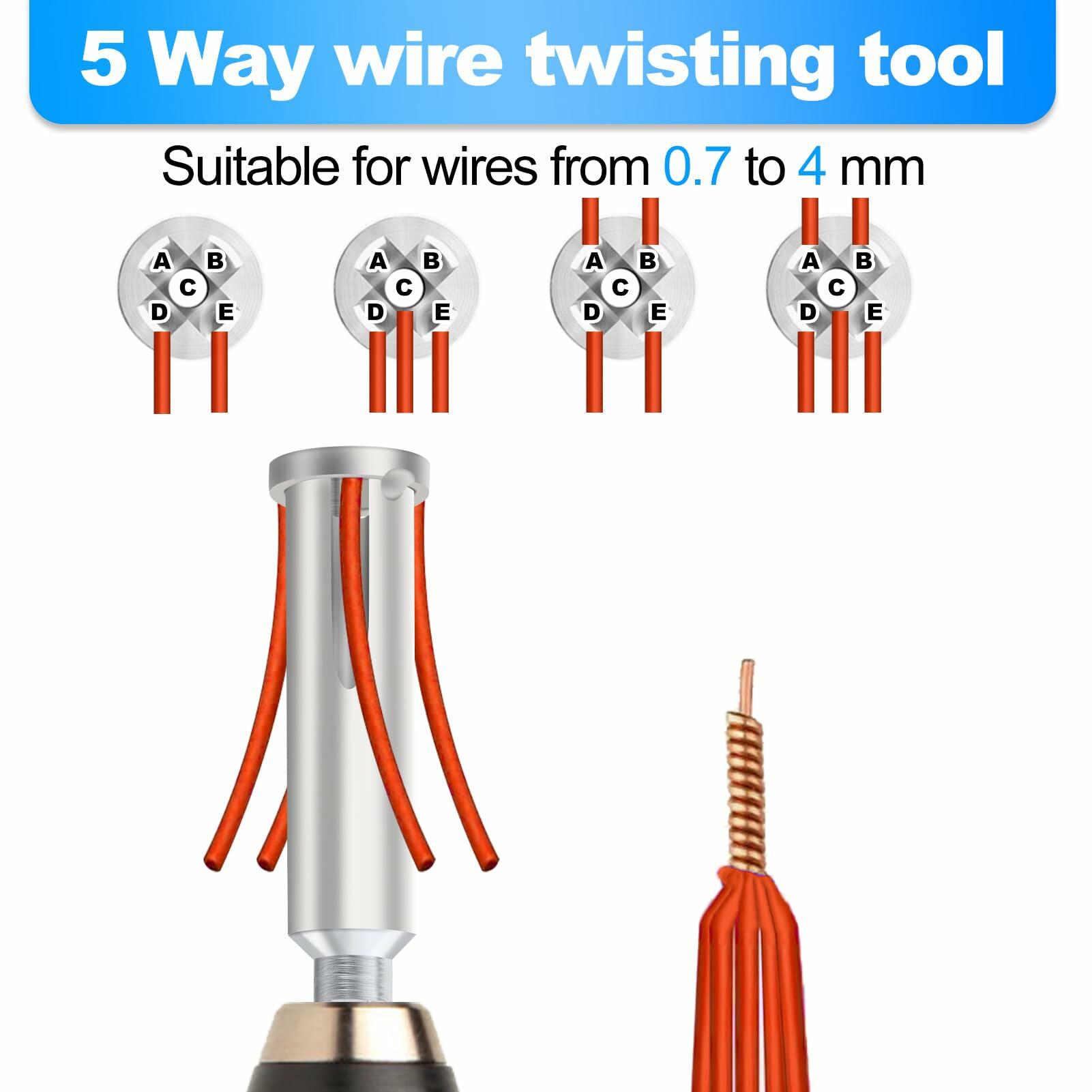 【Multiple Sizes】The nut wire twisting for drill comes in three sizes,3 way and 5 way 3.54 inches 0.79 inches x 0.79 inches, JG4000 2.36 inches 0.79 inches x 0.79 inches. Suitable for wires from 0.7 to 4 mm, holds 2 to 5 wires.