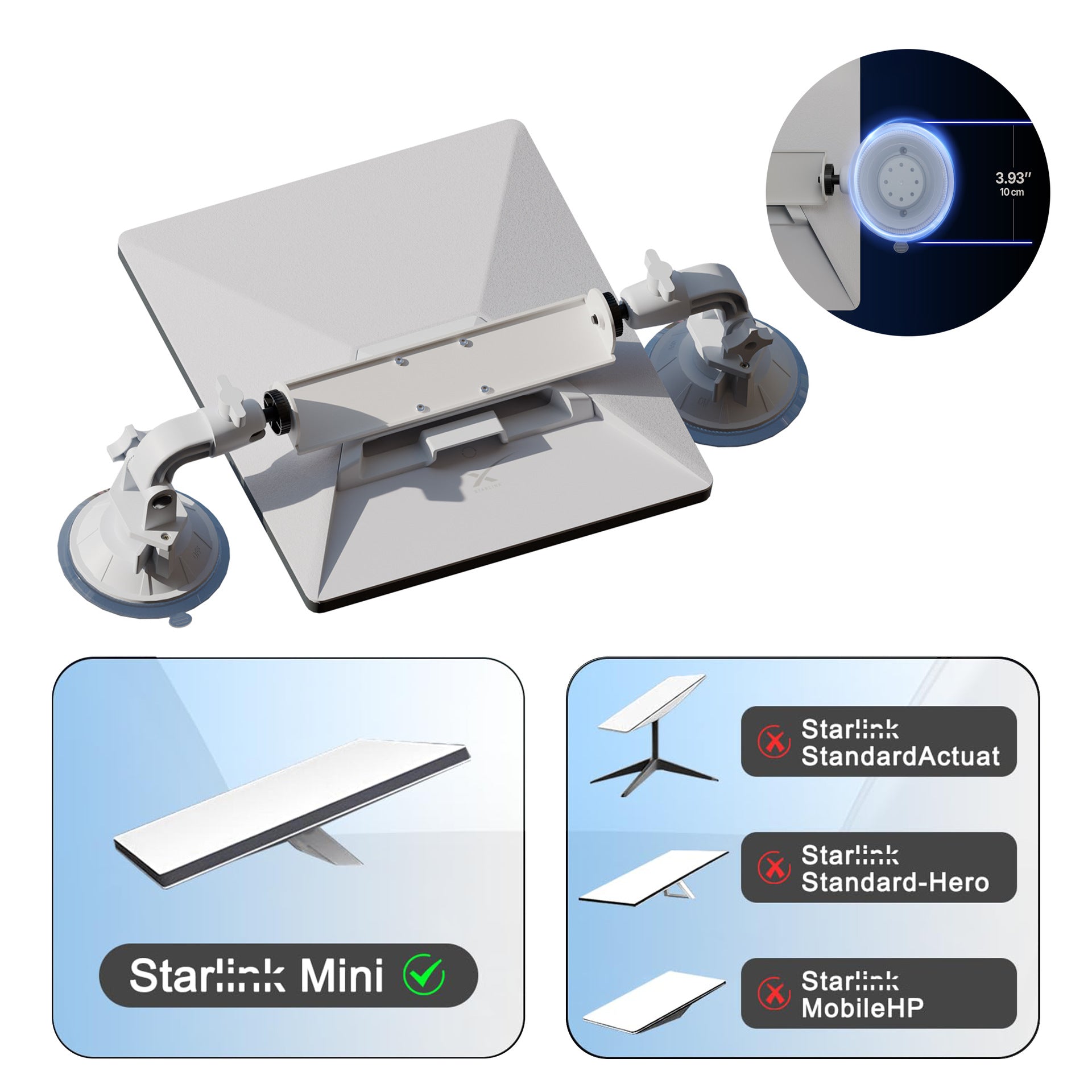 NOTE: This Starlink Mini suction cup is designed for immediate use without assembly. It can be easily repositioned and reused multiple times. For optimal performance, always ensure the suction cup surface is clean; if it gets dirty, simply clean it thoroughly before reapplying.