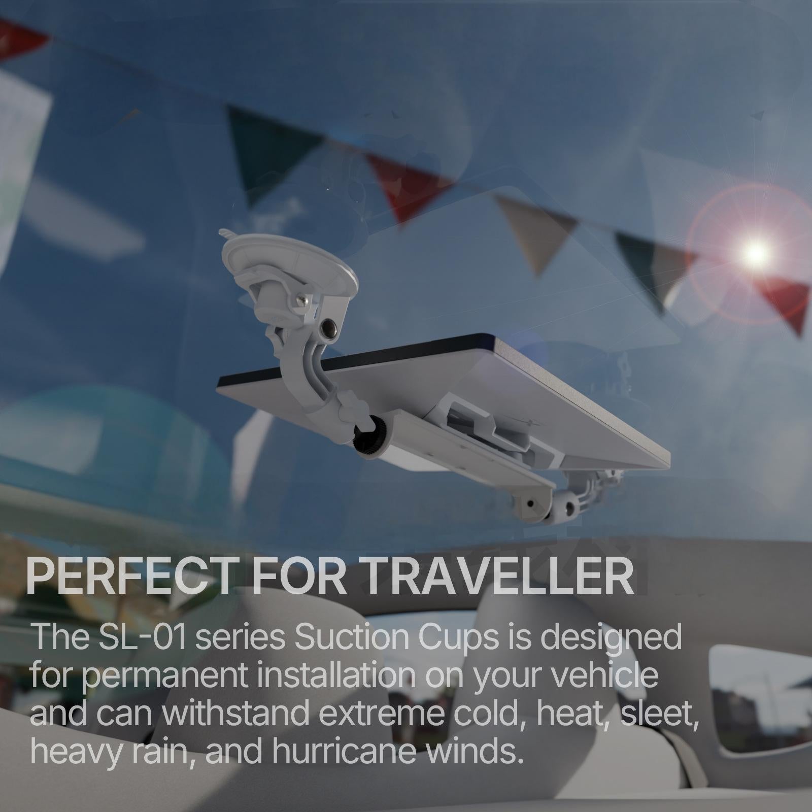- Durable & Weatherproof Design: The SL-01 series is built to withstand extreme weather conditions. Whether it's extreme cold, intense heat, sleet, heavy rain, or even hurricane-force winds, this mount is designed for reliable performance, making it perfect for travelers and long-term vehicle installations.