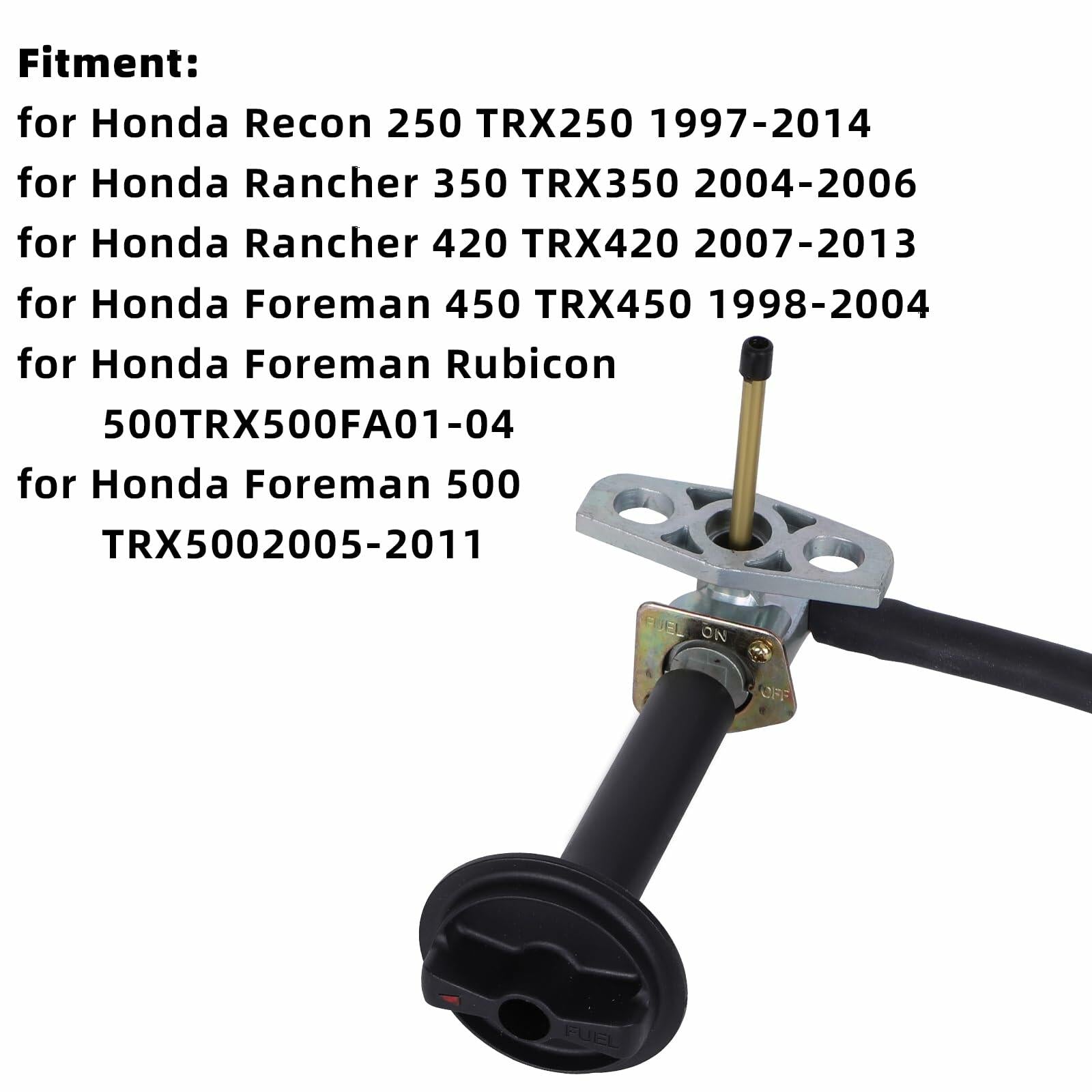 Package: Fuel Petcock Kit *1 Oil Tube *1 Filter *1 Clasp *2 Lever *1 Manufacturer Part: 16950-HN7-003 16963-HM8-000ZA This Accessories fits the following models: 1998-2001 Honda Foreman 450 TRX450ES 4x4 ES 1998-2001 Honda Foreman 450 TRX450S 4x4 S 2002-2004 Honda Foreman 450 TRX450FE 4x4 ES 2002-2004 Honda Foreman 450 TRX450FM 4x4 S 1995-1996 Honda FourTrax Foreman 400 TRX400FW 4x4 1997-2003 Honda Foreman 400 TRX400FW 4x4 2007-2013 Honda Rancher 420 TRX420FE 4x4 ES 2007-2013 Honda Rancher 420 TRX420FM 4x4 2007-2013 Honda Rancher 420 TRX420TE 2x4 ES 2007-2013 Honda Rancher 420 TRX420TM 2x4 2009-2013 Honda Rancher 420 TRX420FA 4x4 AT; 2009-2013 Honda Rancher 420 TRX420FPA 4x4 AT EPS 2009-2013 Honda Rancher 420 TRX420FPE 4x4 ES EPS This Accessories fits the following models: 2009-2013 Honda Rancher 420 TRX420FPM 4x4 EPS 2013 Honda Rancher 420 TRX420PG Canadian Trail Edition 1997-2001 Honda Recon 250 TRX250 2x4 2002-2014 Honda Recon 250 TRX250TE 2x4 ES and TRX250TM 2x4 2000-2006 Honda Rancher 350 TRX350FE 4x4 ES 2000-2006 Honda Rancher 350 TRX350FM 4x4 S 2000-2006 Honda Rancher 350 TRX350TE 2x4 ES 2000-2006 Honda Rancher 350 TRX350TM 2x4 S 2005-2009 2011 Honda Foreman 500 TRX500FE 4x4 ES 2005-2009 2011 Honda Foreman 500 TRX500FM 4x4 S 2005-2006 Honda Foreman 500 TRX500TM 2x4 This Accessories fits the following models: 2007-2008 Honda Foreman 500 TRX500FPE 4x4 ES EPS 2008-2009 2011 Honda Foreman 500 TRX500FPM 4x4 EPS 2009 Honda Foreman 500 TRX500FPA 4x4 AT EPS 2009 2011 Honda Foreman 500 TRX500FPE 4x4 ES EPS 2001-2009 2011-2012 2014 Honda Foreman Rubicon 500 TRX500FA 4x4 2005-2008 Honda Foreman Rubicon 500 TRX500FGA 4x4 GPScape 2011 Honda Foreman Rubicon 500 TRX500FPA 4x4 GPScape 2012 Honda Foreman Rubicon 500 TRX500FPA 4x4 EPS