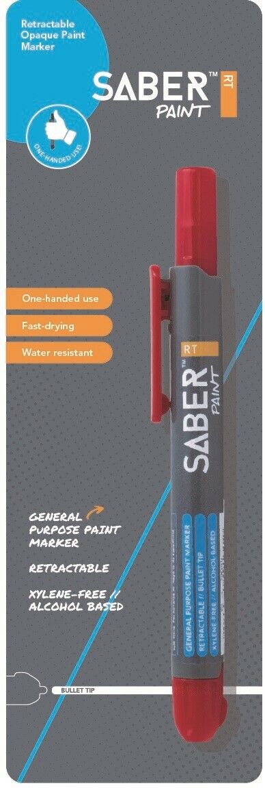 Free-up one hand to complete your task while never losing a cap again. The FIRST EVER retractable paint marker, SABER PAINT RT leaves a long lasting, Xylene-free, opaque mark. Remains permanent on almost any dry or damp/oily surface: Metal, Plastic, Glass, Paper, Rubber, Cement, Tile, Wood, Stone, Vinyl.