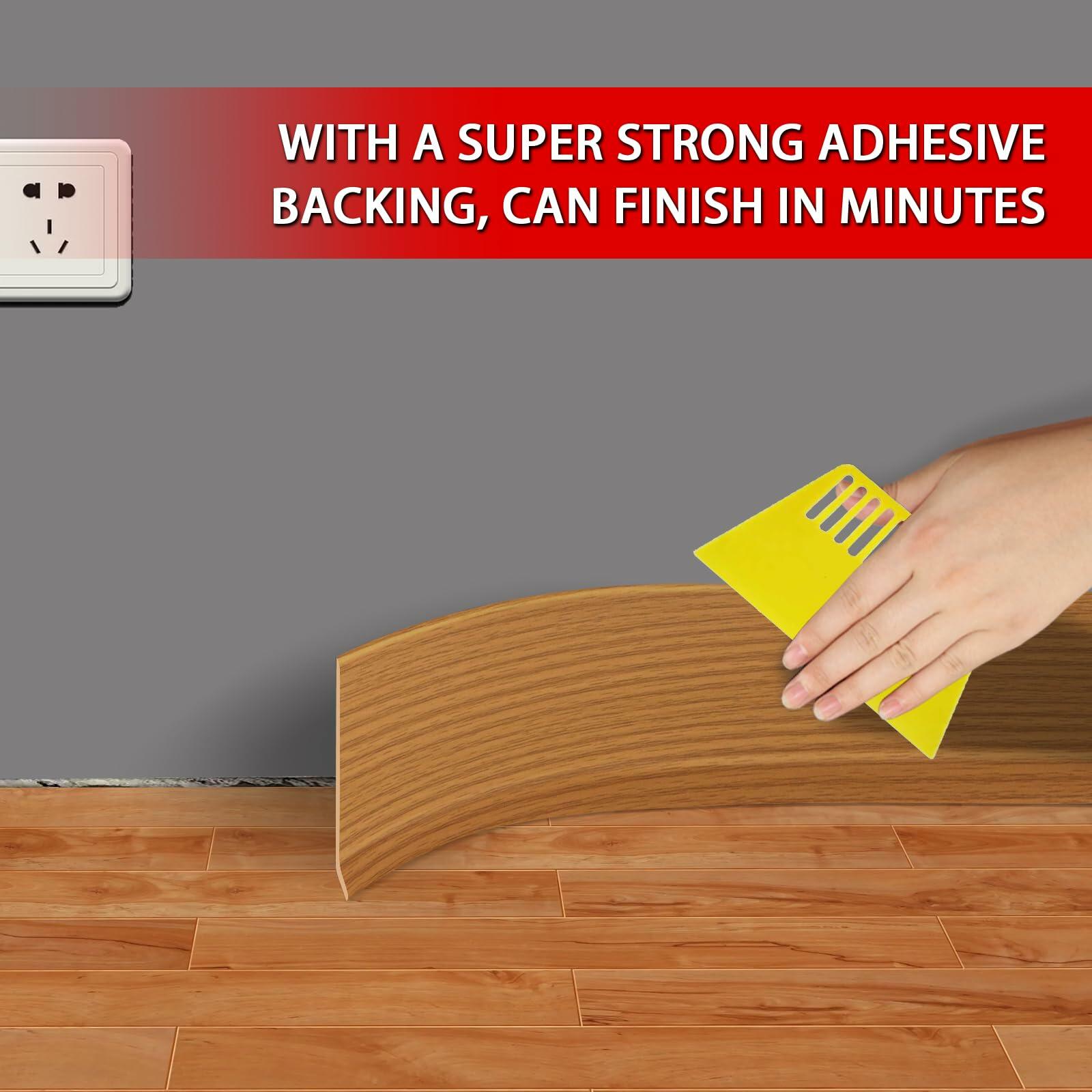 - Self-adhesive Design: this flexible peel and stick vinyl baseboard with a strong adhesive backing is very convenient to complete the installation. Note: If the temperature is below 68℉, please use a hair dryer to heat the adhesive before sticking it to the wall.