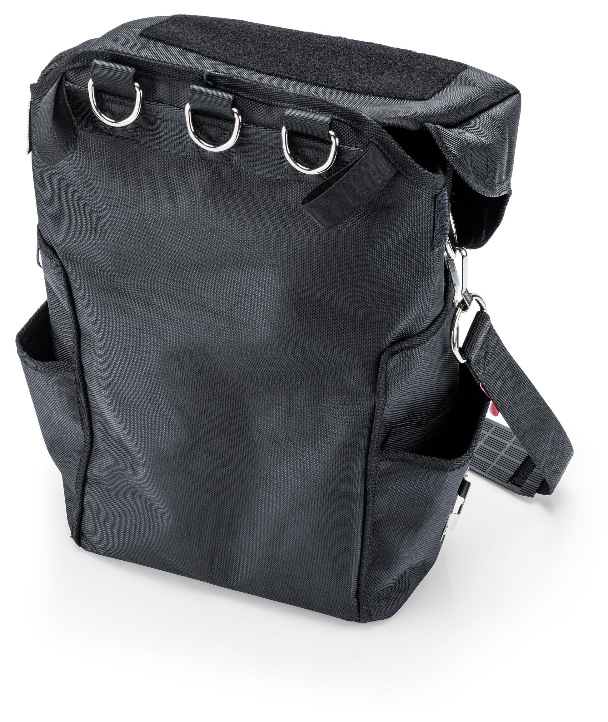 Two inner compartments with 18 slots for tools. 11 attachment D-rings and 5 outer pockets. External metal retaining clips for example for cordless power tools. Removable shoulder strap for comfortable transport, when not working at heights. Hook and loop patch for individual labelling. Easily carry up to 33 lbs. of tools and gear to your next job site. Material: Polyester 1680D, polyester strap.