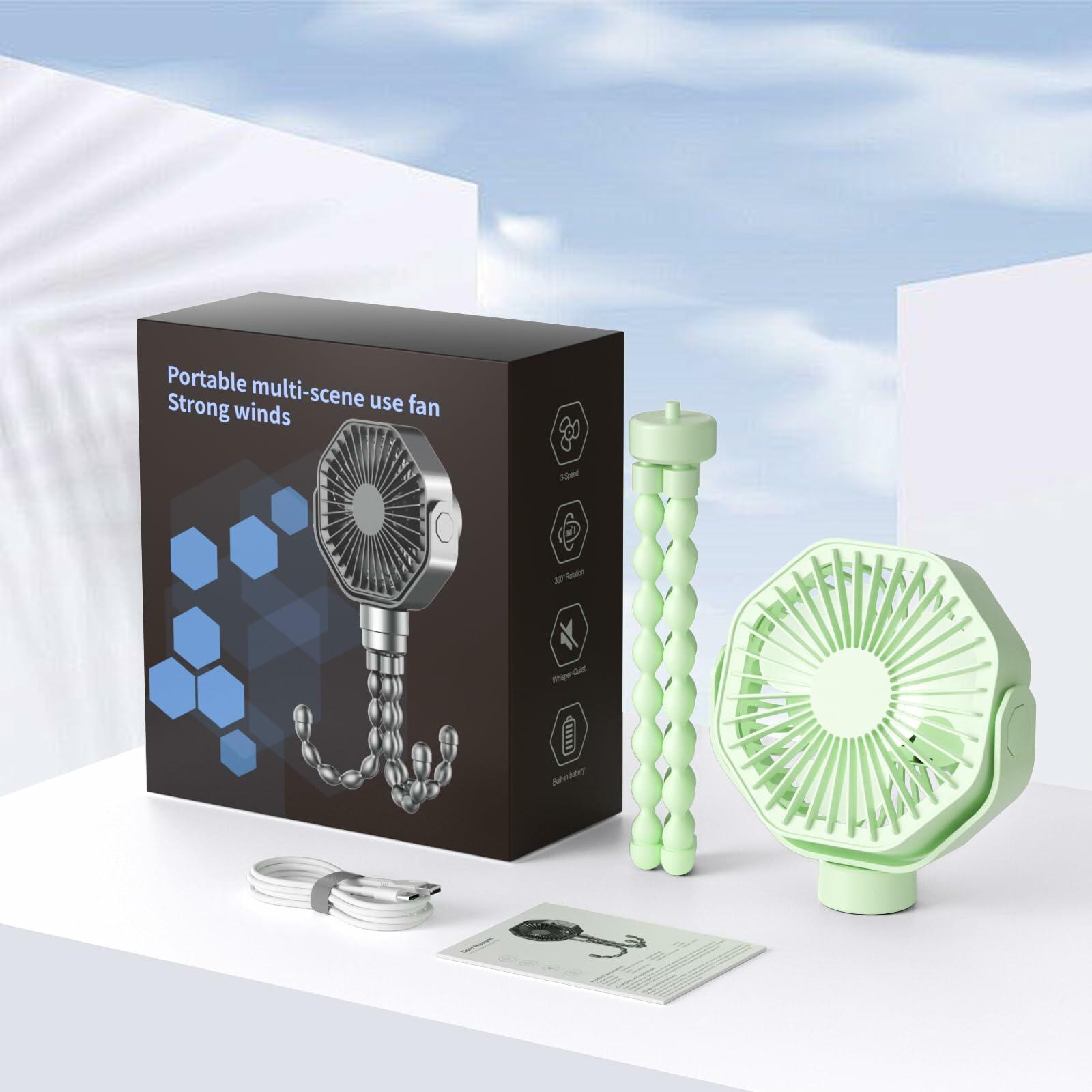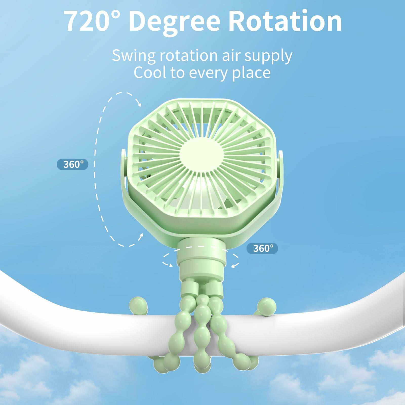 - 【4 in 1 Multifunction Fan】The small fan with unique flexible tripod design, This multifunctional design makes the stroller fan can be used in desktop, winding, hanging and handheld applications for Travel, Stroller, the edge of a Desk, Treadmill, Golf Cart