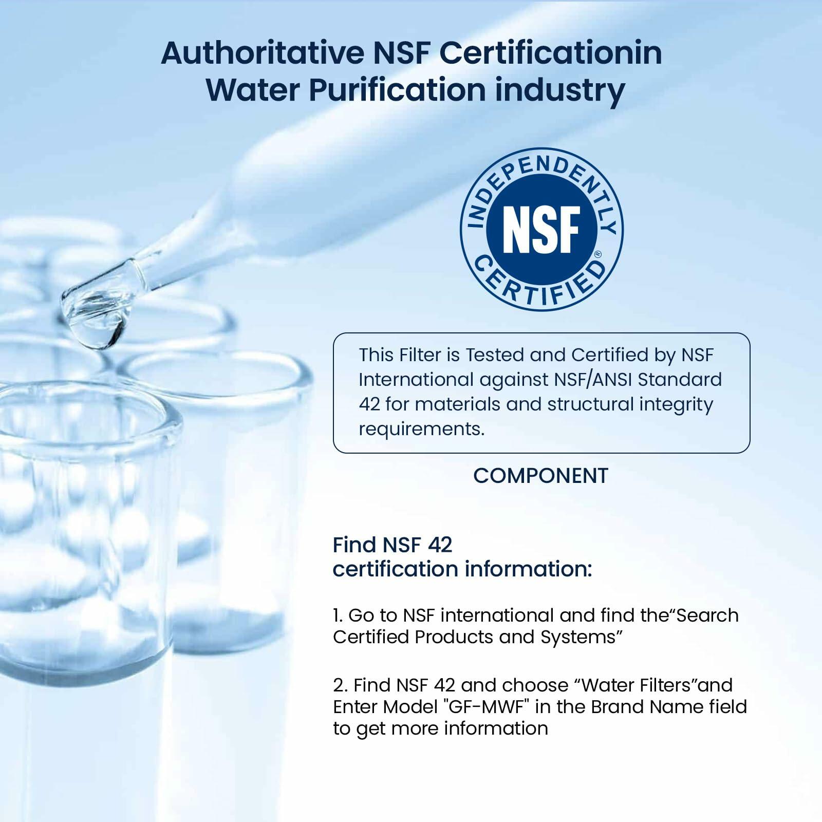 - GLACIER FRESH GF-MWF Water Filter Statement: The materials and construction comply with the NSF42 standard. Go to NSF’s database, the manufacturer "Ningbo Pureza Technology, LLC" and model number "GF-MWF". If you find that the product is not NSF42 certified, you can apply for a ten-fold claim for the purchase amount.