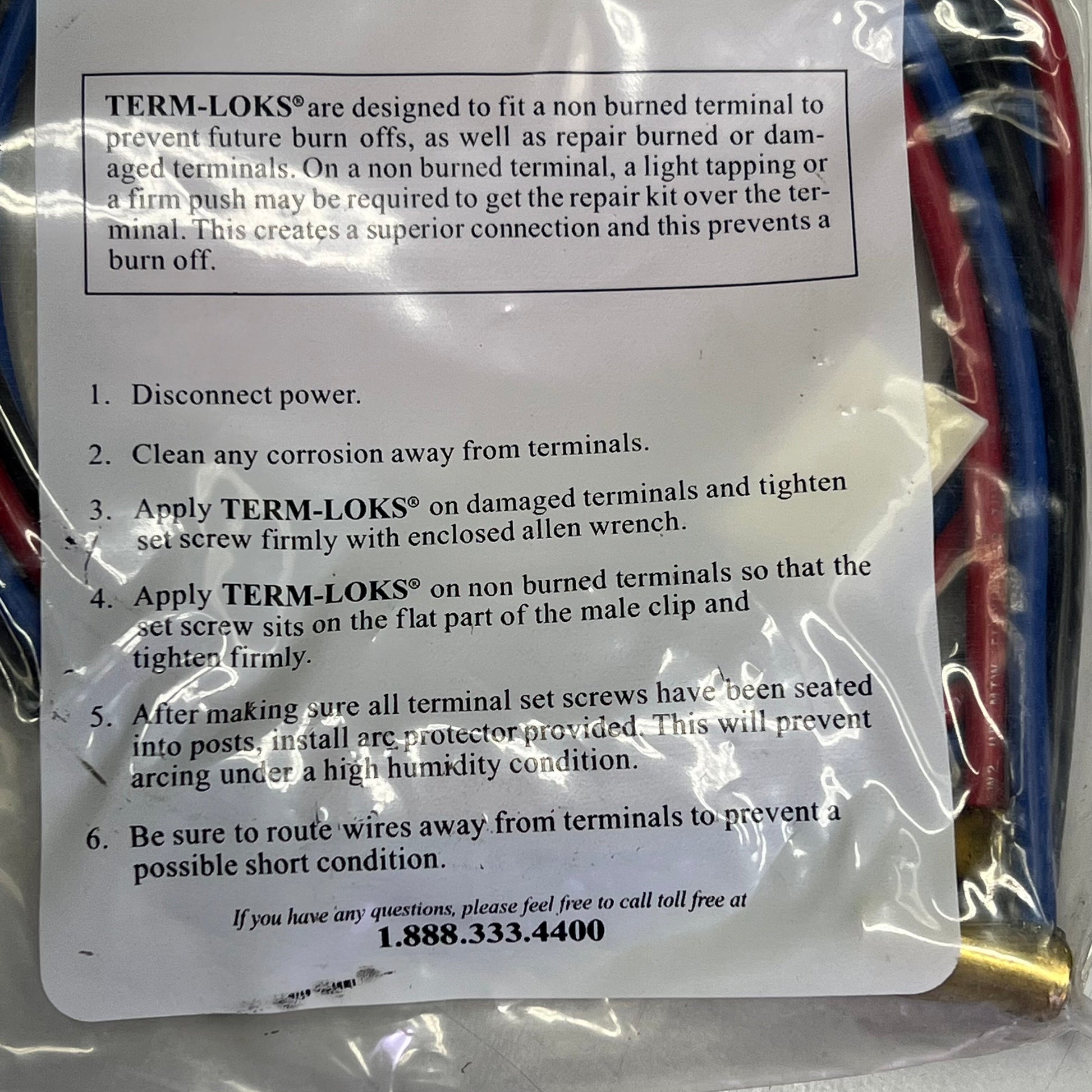Term-Lok is a brass cylindrical tube with a diameter large enough to slip over the pins and has a stainless set screw to lock onto the terminal. TermLok comes in packages of one or three terminal locks with color coded 65 strands, 600 volt permanently attached wire, with wrench provided for easy application. Once installed the compressor cover may be placed back over the terminals without any obstructions.