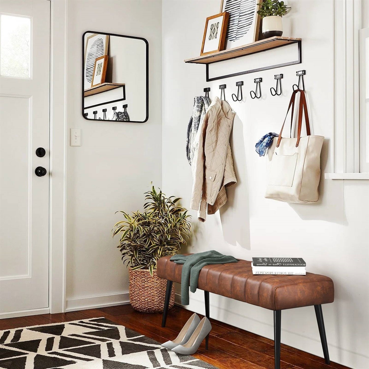- Mid-Century Modern Bedroom Bench with Brown PU Leather Seat and Tapered Legs