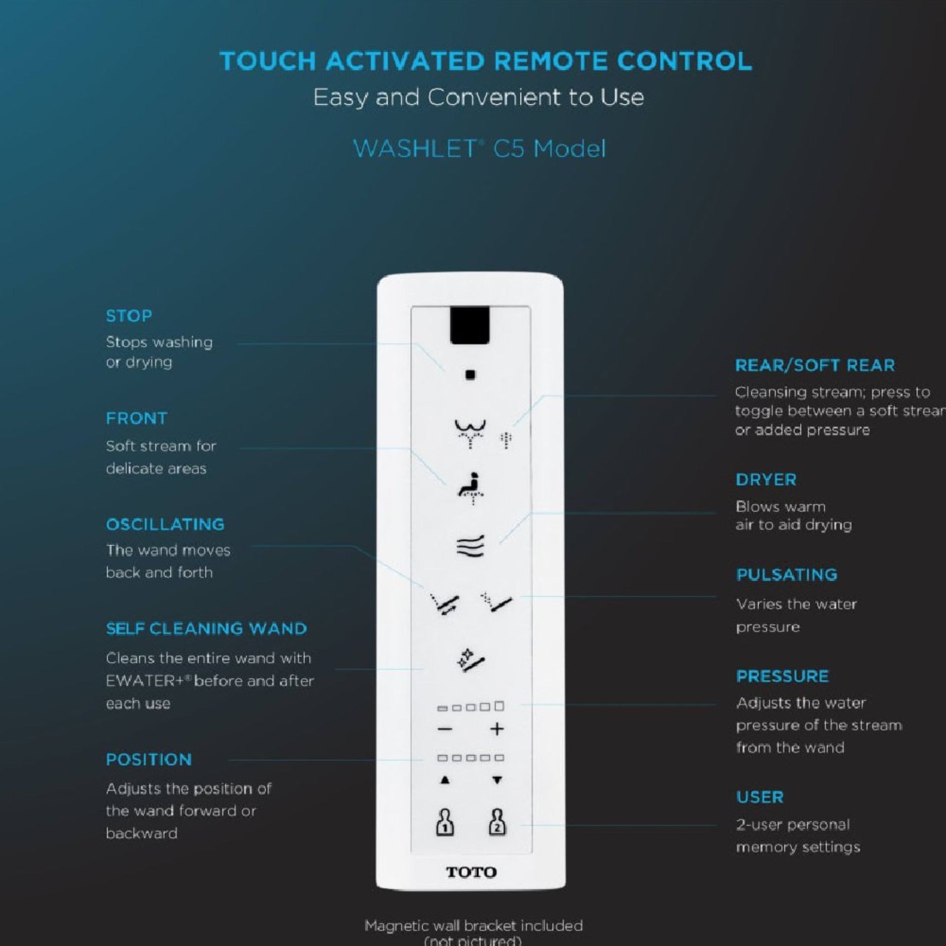 - Experience ultimate comfort with adjustable temperature and pressure settings for both rear and front cleanse options. Tailor your experience with five settings for water temperature and pressure, all easily controlled via a slim, wireless remote.