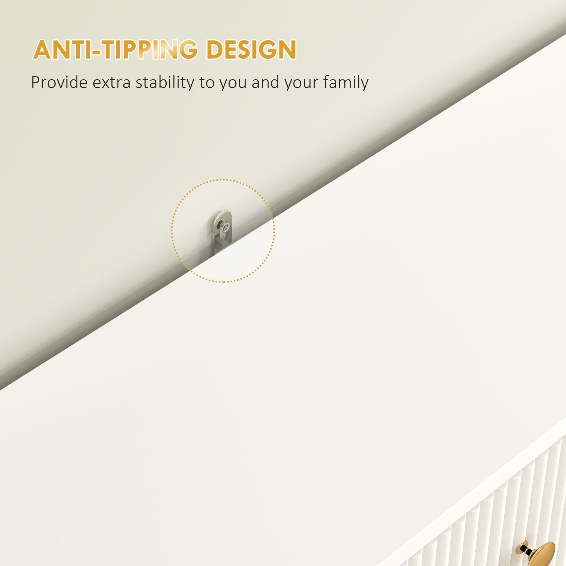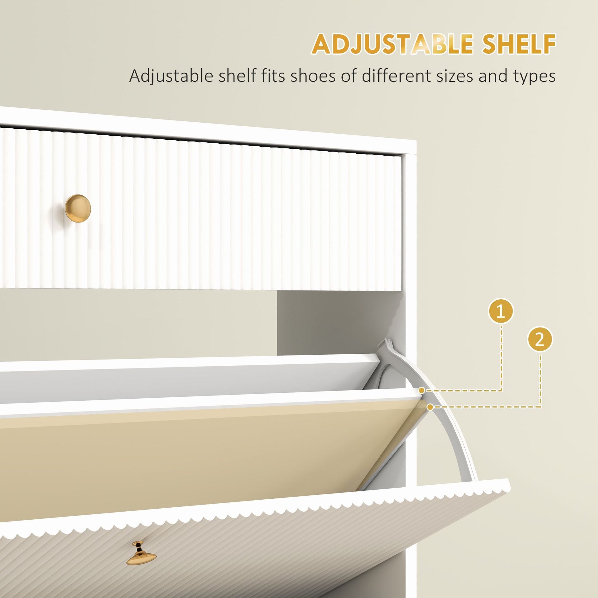 - Modern Elegance: This slim shoe cabinet features a sleek white finish, wave-like fluted panels, and gold handles, enhancing its visual appeal for your entryway or living room.