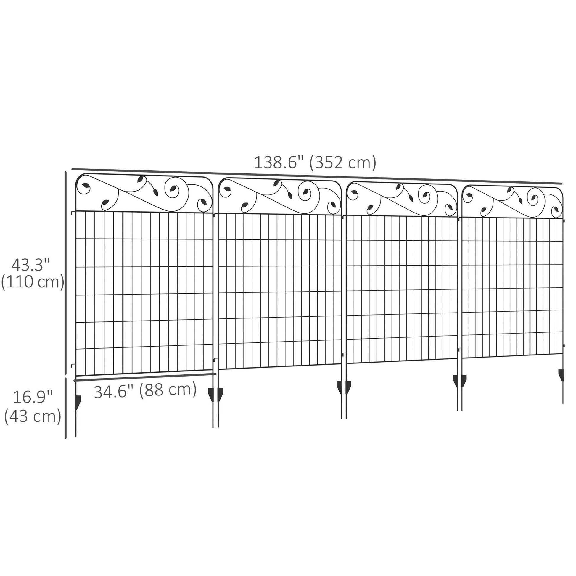 - Four-Panel Outside Fence: This decorative garden fencing comes with four panels measuring 34.6" (88 cm) long and 43.3" (110 cm) high per purchase. Each set of panels can reach a maximum length of 11.5' (352 cm) in total. Please measure your space and determine your needs before you decide how many sets of panels should be purchased.