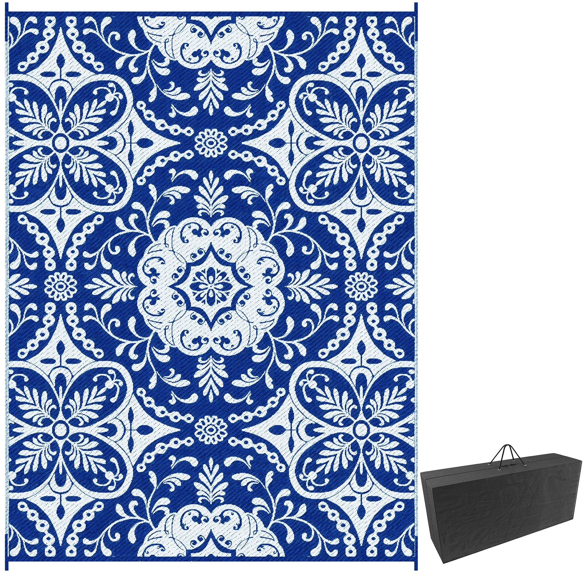 Portable Outdoor Rug with Carry Bag, 9' x 12' Reversible Mat, Waterproof Plastic Straw RV Rug for Backyard, Deck, Picnic, Beach, Camping, Blue & White Flower