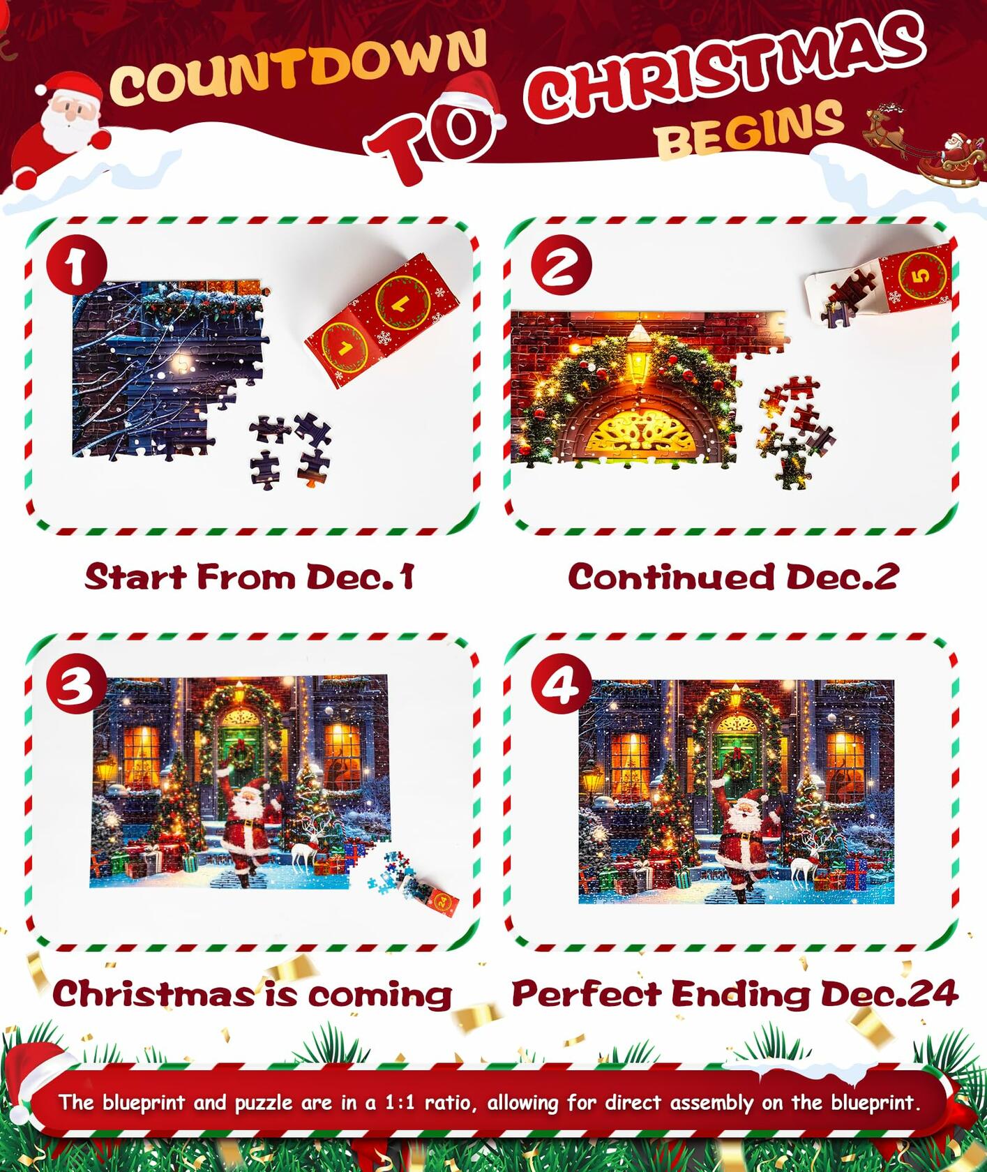- 🎄【Christmas Countdown Puzzle Box】Unwrap the excitement with our 2024 Christmas countdown puzzle box! Inside are 24 small boxes, each revealing a puzzle piece. Complete one piece every day from December 1st to 24th. On Christmas, uncover the mystery and enjoy a stunning holiday artwork.