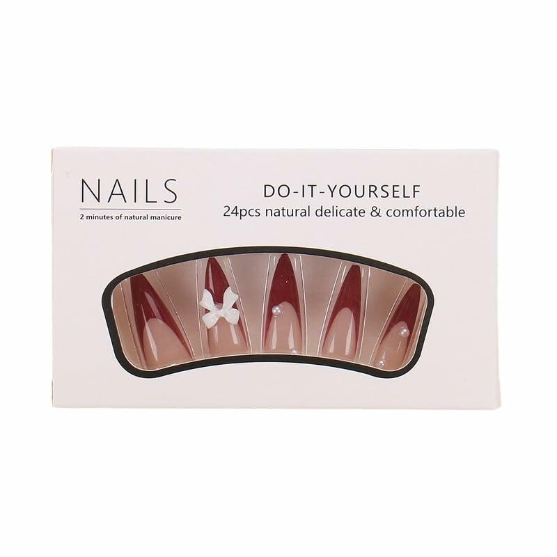 Red French Press On Nails Almond Medium Glossy Bow Pearl 24 Pcs