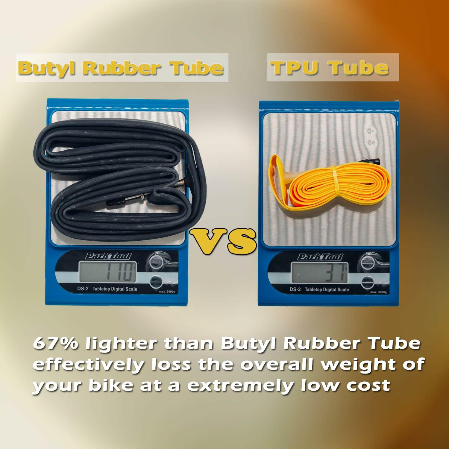 - Lower Rolling Resistance: Riding faster in TPU inner tube is based on decreasing 20% of Rolling Resistance than butyl rubber inner tube. Lighter, softer and lower friction make this happen.