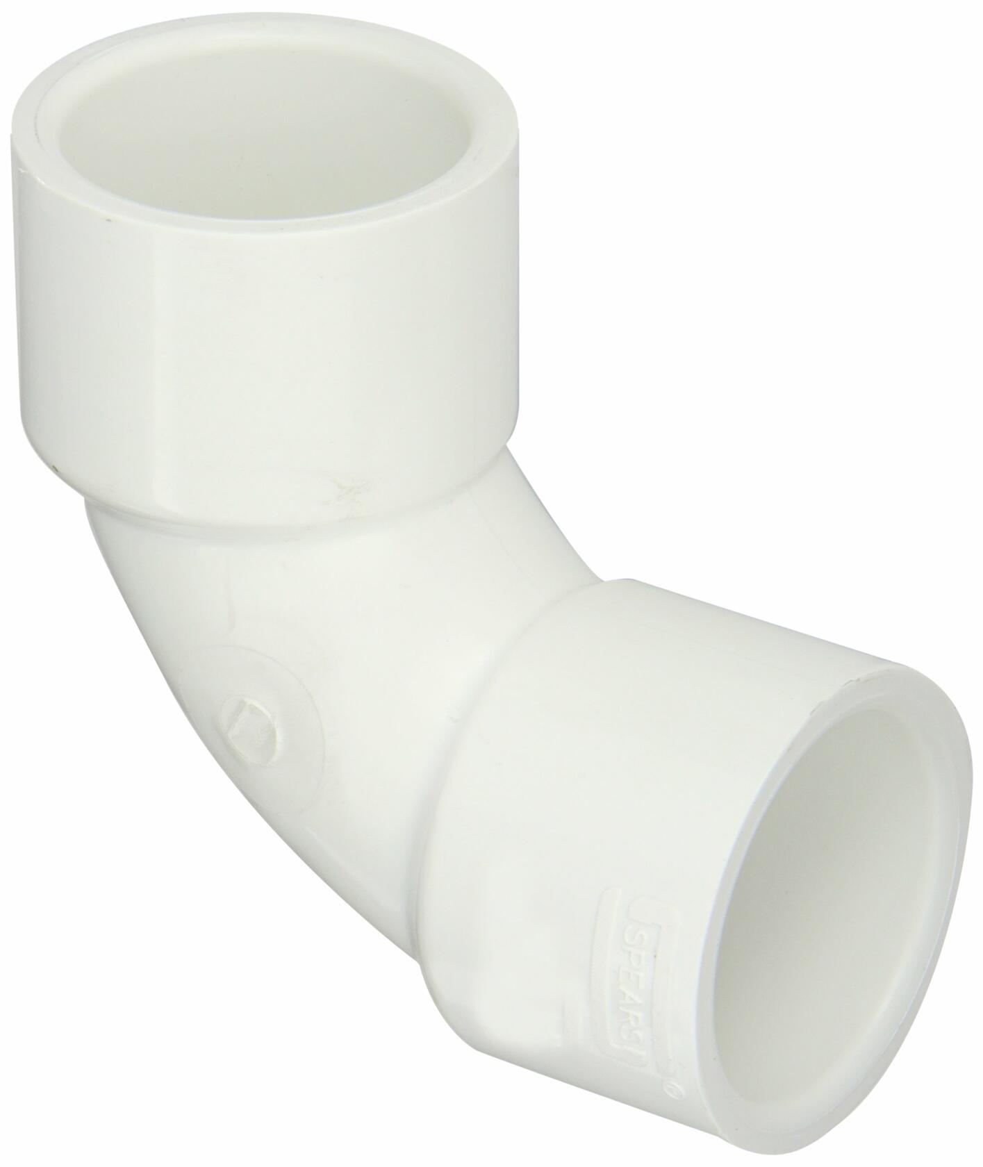This Spears 90-degree sweep elbow pipe fitting is made of schedule 40 PVC and has socket end connections. This 90-degree sweep elbow fitting, or "ell," connects two pipes at an extended 90-degree angle to change the direction of flow between pipes with less flow resistance than connecting two pipes or fittings at an angle. It has female socket connections for sliding over the ends of unthreaded male pipes or fittings. The socket ends connect to pipes with a smooth bore for enhanced flow. This schedule 40 (standard wall) fitting is made of PVC (polyvinyl chloride) for corrosion resistance, high strength, and less weight than fittings made from metal. It is compatible with schedule 40 PVC pipes and fittings. PVC can be connected to other materials such as steel, copper, or cast iron using transition fittings. This fitting provides superior flow to metal because of its smooth interior finish, which reduces friction and inhibits buildup of materials. This fitting complies with National Sanitation Foundation International (NSF)/American National Standards Institute (ANSI) 61 Annex G, NSF/ANSI 372, and conforms with lead content requirements for “lead free” plumbing as defined by California, Vermont, Maryland, and Louisiana state laws and the U.S. Safe Drinking Water Act due to take effect January 2014. This 90-degree sweep elbow pipe fitting is suitable for use in cold-water pressure distribution systems including irrigation, pool and spa, potable water, and chilled water applications.Pipe fittings are components used for connecting, terminating, controlling flow, and changing the direction of piping in many different industries. When purchasing pipe fittings, consider the application, as this will affect material type, shape, size, and required durability. Fittings are available threaded or unthreaded, in many shapes, styles, sizes, and schedules (pipe wall thickness).Spears Manufacturing produces thermoplastic fittings and valves for fluid, drain, waste, and vent systems. The company, founded in 1969 and headquartered in Sylmar, CA, meets International Organization for Standardization (ISO) standard 9001.