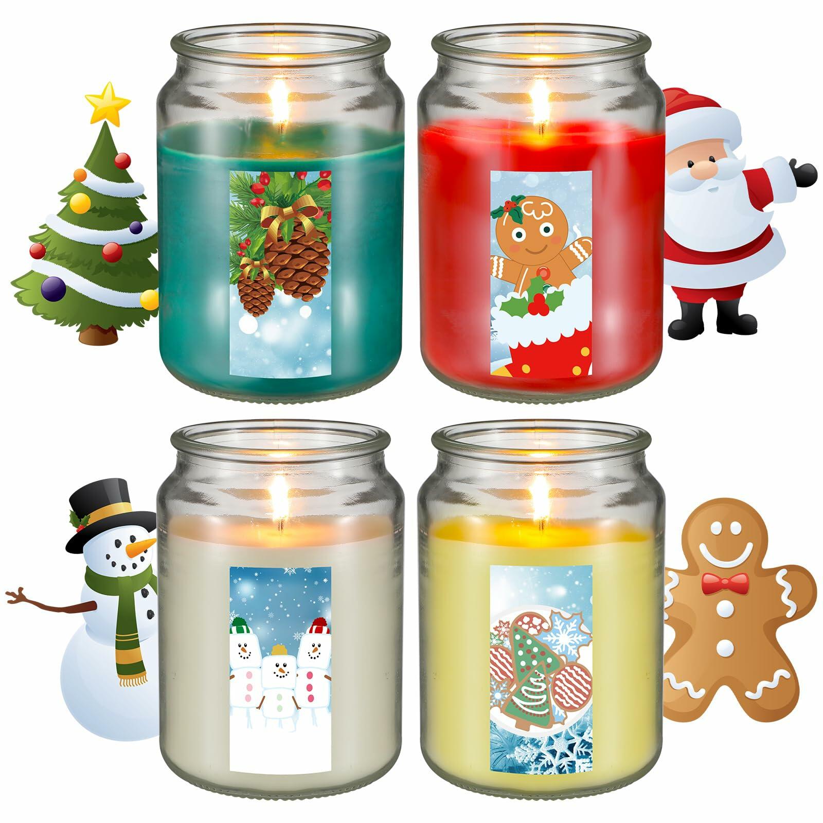 - Christmas Package: our package includes 4 pack large jar single wick Christmas scented candle, the scent come in 4 styles, they are Christmas tree, apple, cookies, snowflake mint; And 8 pcs Christmas stickers with different designs, such as gingerbread man, snowman, snowflakes, pine cones, cookies, house, you can choose your favorite stickers to stick on the Christmas candle jar; Elevate your holiday decor with soy candle set, each jar candle is uniquely scented to capture the essence of holiday