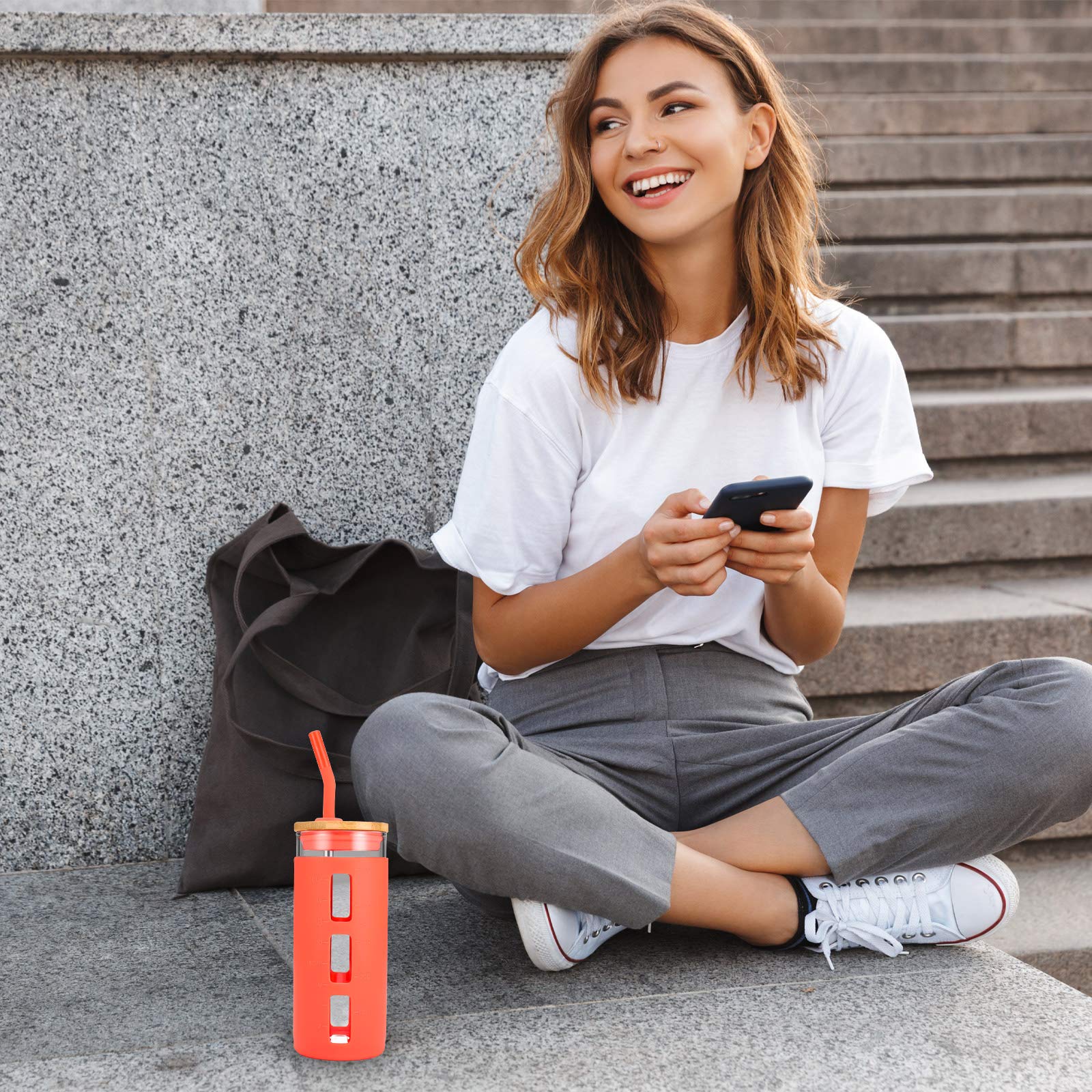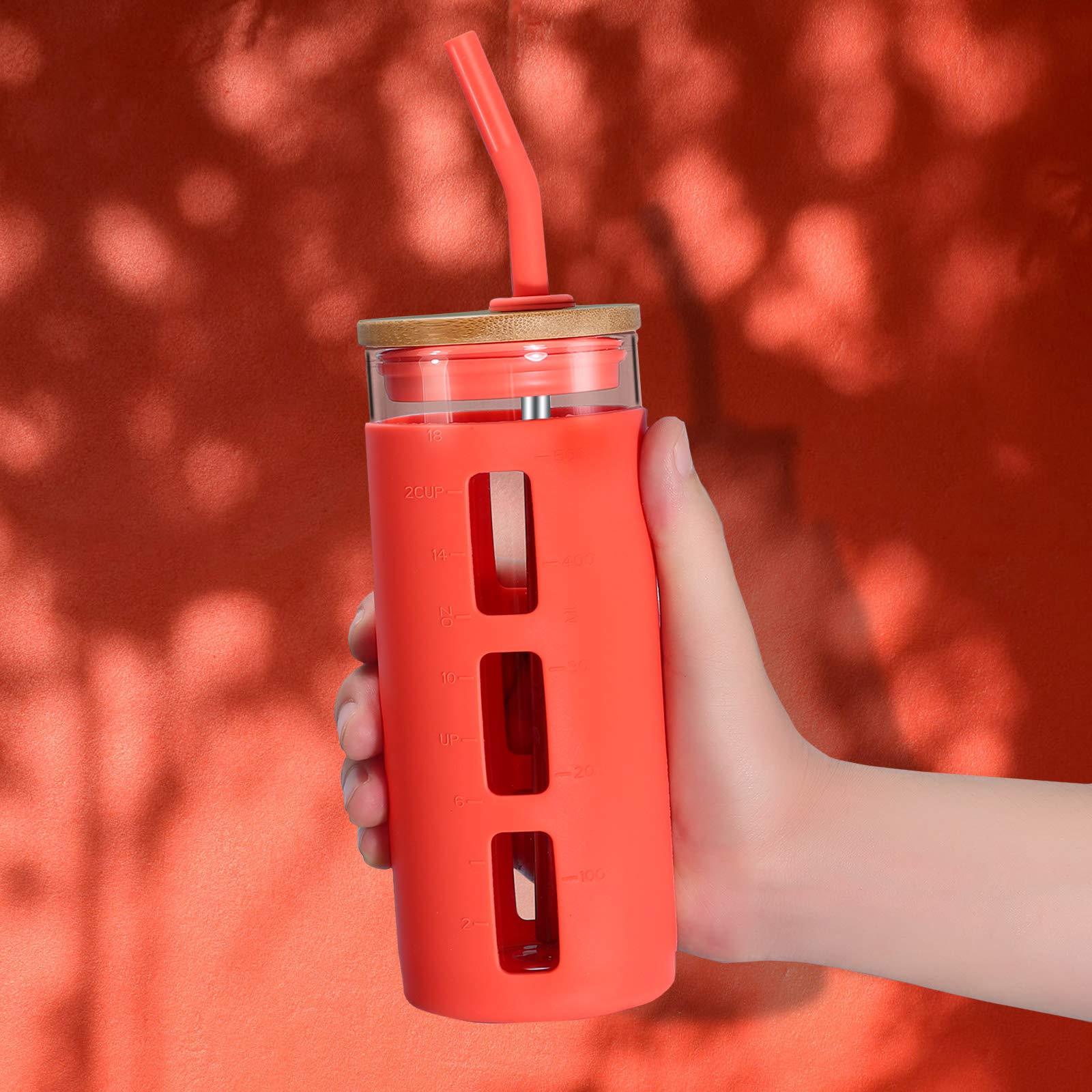 - Dishwasher and Microwave Safe,Spill Proof- the versitile large capacity clear glass water cup with colored silicone protetive sleeve is great for hot and cold drinks, iced tea, iced coffee,latte,smoothie,lemonade, milk,fruit beverage, at any occasion, office, home, bedside,campsite, gym,beach,poolside, Thanks to the measurement marking, you can easily keep track of your daily water intake,