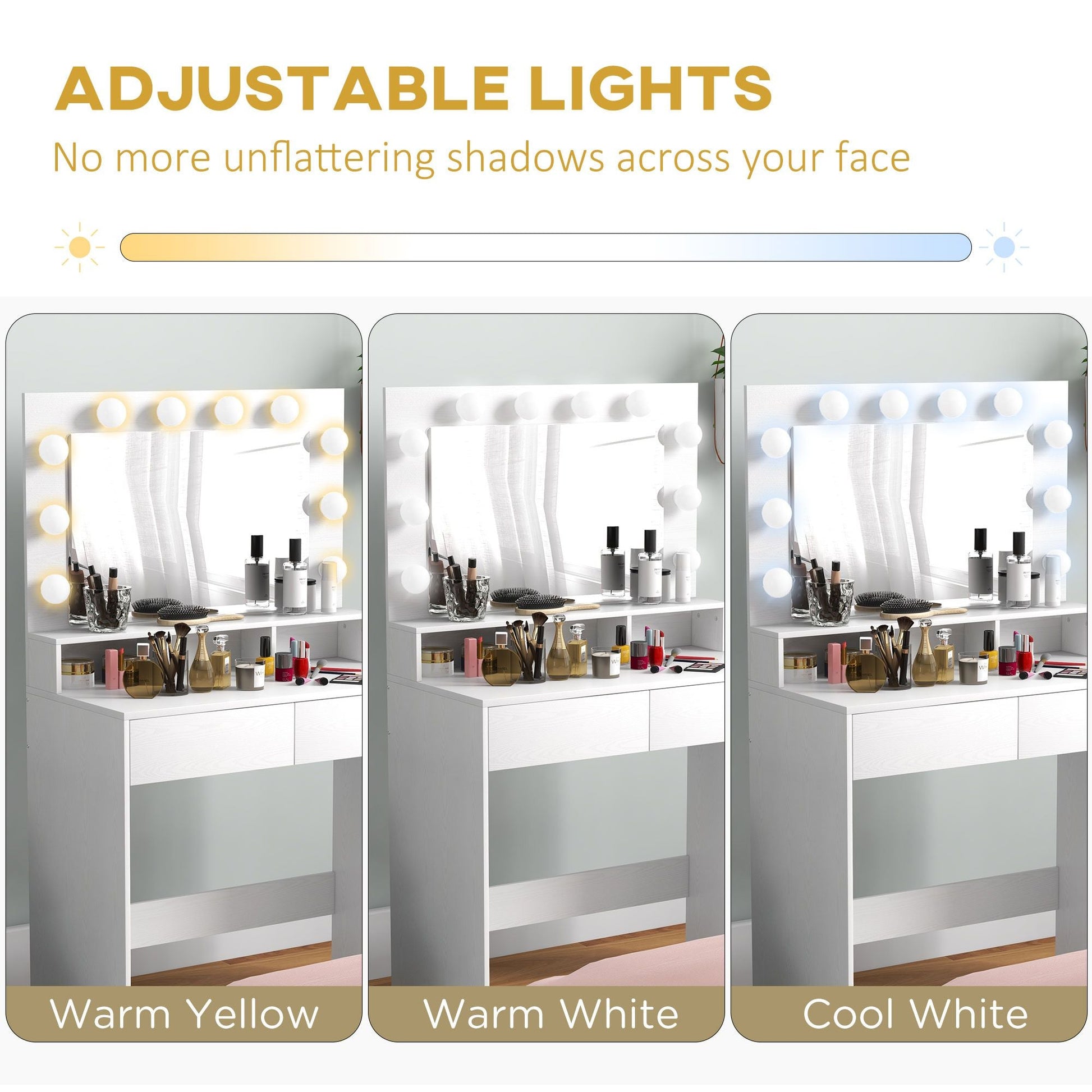 - Bright & Adjustable Lighting: This makeup vanity desk features a large mirror with 10 Hollywood-style bulbs, offering adjustable lighting with three light settings for different makeup application.