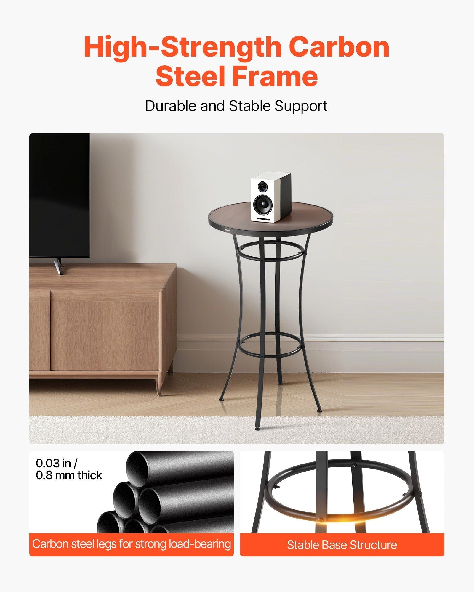 2.Durable High-Strength Frame: The bar height bistro table carbon steel legs and bottom support structure ensure stability, making the table sturdy enough to hold decanters, glassware, snack plates, and even a beer bucket without wobbling.